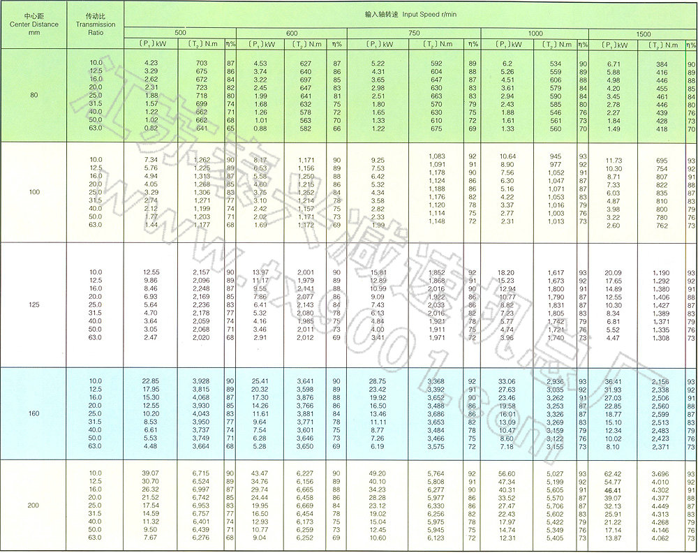 五、平面包络环面蜗杆减速器额定输入轴功率表