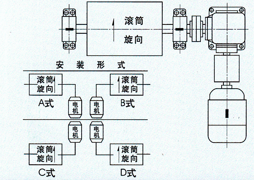 1.逆止型的滚筒选型与本厂标准不同时,需在订货时注明,站在电机尾部看,电动滚筒的旋转方向。 2.YTH-III型滚筒中,按电机安装形式不同分四种形式,需在订货时注明。