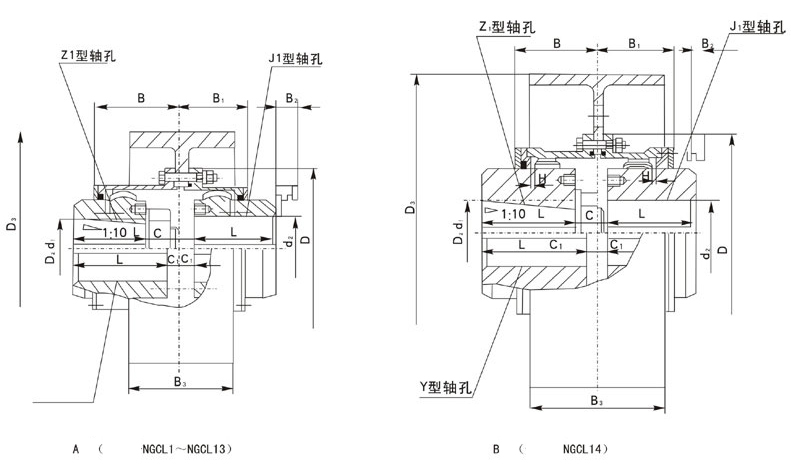 注:1、联轴器轴孔组合有Z1/J1、Y/Y、J1/J1、Y/J1