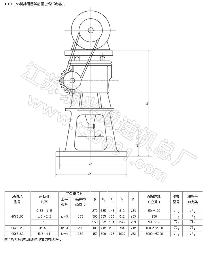 GCWS系列蜗杆减速机采用了轴截面为圆弧形的圆柱蜗杆,蜗轮齿形为与蜗杆相共轭的圆弧,故凸凹啮合。具有性能可靠,承载能力强,体积小,噪声低, 运转平稳,效率高,密封好等优点。主要配套安装于化工、制药、造纸、酿酒等容器上作传动搅拌用。特别与搪玻璃反应罐配套安装,由于设计采用了直径较大的蜗 轮轴,并加长了该轴的两上轴承支撑点距离,改变了原来靠通用支架联接三轴一体的传动搅拌形式为减速机与搅拌器直联一体的传动搅拌形式。从而比同类产品体积 小1/3,承载能力强0.5-1.5倍,传动效率提高10%-20%。